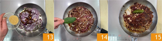 Adicione também o açúcar mascavo 13, uma folha de louro 14 e cozinhe em fogo baixo por 15 minutos. As cebolas devem ficar bem caramelizadas 15.