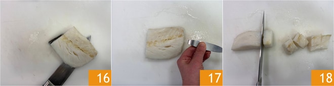Retire a pele do bacalhau 16, elimine as espinhas com uma pinça 17 e corte-o em cubos grandes 18.