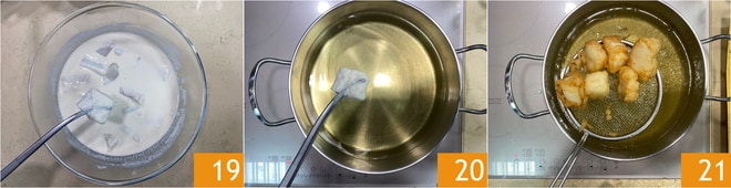 Imersa o bacalhau na massa, de modo a cobrir os cubos uniformemente 19. Depois mergulhe-os no óleo quente 20, poucos de cada vez, para não baixar a temperatura do óleo 20. Escorra-os quando estiverem dourados 21.
