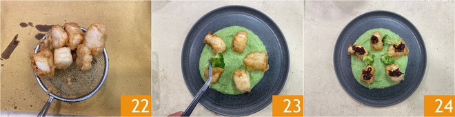 Transfira o bacalhau frito para uma bandeja com papel de cozinha 22. Continue com o restante da fritura e então monte o prato: no fundo, coloque o creme de brócolis quente, os pedaços de bacalhau e as florzinhas de brócolis 23. Coloque sobre o peixe também a cebola caramelizada e sirva imediatamente o seu bacalhau em tempura com brócolis 24!