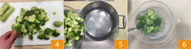 Limpe o brócolis e separe as florzinhas 4; retire a casca do talo e corte-o em cubos. Escalde tudo em água salgada por 4 minutos 5, depois escorra e transfira para água gelada 6.