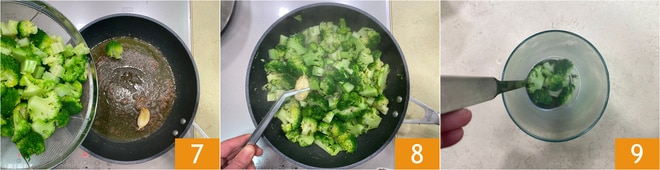 Enquanto isso, prepare um refogado com óleo, alho e as anchovas. Uma vez derretidas, adicione os brócolis escorridos 7. Salteie por mais 5 minutos, depois retire o dente de alho 8 e transfira os brócolis para um recipiente alto e estreito 9. Reserve algumas florzinhas para a decoração dos pratos e bata o restante, adicionando uma concha de água do cozimento até obter um creme.