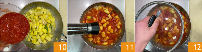 Agora adicione os tomates pelados amassados 10, misture e ajuste o sal e a pimenta 11. Cubra com uma tampa 12 e cozinhe por 30 minutos em fogo médio, mexendo de vez em quando, ou até que as batatas estejam macias.