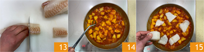 Enquanto isso, corte os filés de bacalhau em pedaços menores 13, removendo eventuais espinhas. Após os 30 minutos, retire os talos de salsinha e o alho da frigideira 14, e acomode o bacalhau 15.