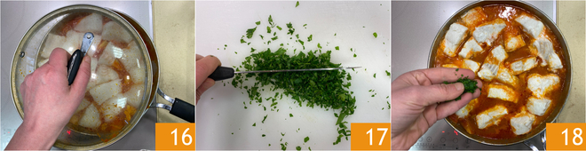 Volte a cobrir com uma tampa 16 e cozinhe por mais 20 minutos ou até que o peixe esteja cozido. Enquanto isso, pique finamente as folhas de salsinha 17 e polvilhe na frigideira no final do cozimento 18.