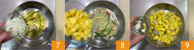 Adicione também as cebolas à frigideira 7 e refogue por 7-8 minutos, até que fiquem transparentes. Em seguida, junte as batatas 8 e doure por 5 minutos, mexendo frequentemente. Regue com vinho branco 9 e deixe evaporar todo o álcool, mexendo de vez em quando.