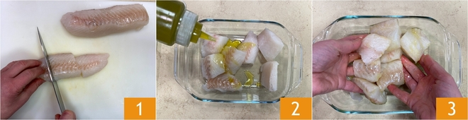 Para preparar o bacalhau na fritadeira elétrica, corte os filés de peixe em pedaços menores, de cerca de 6 cm 1. Coloque os pedaços de peixe em um refratário e tempere-os com azeite de oliva 2, massageie bem para untá-los uniformemente 3.