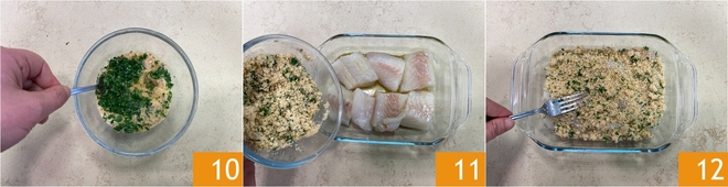 Misture bem a farinha de rosca 10 e despeje metade sobre os pedaços de bacalhau 11, misture bem para aderir o pão ralado 12.
