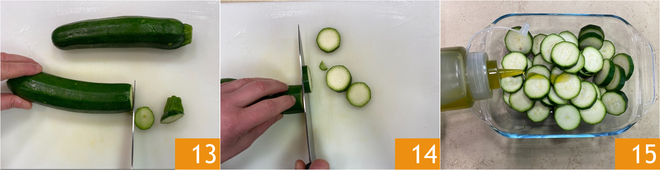 Lave e corte as pontas das abobrinhas 13, depois corte-as em rodelas de cerca de meio centímetro de espessura 14. Coloque-as em uma tigela e tempere com azeite de oliva 15.