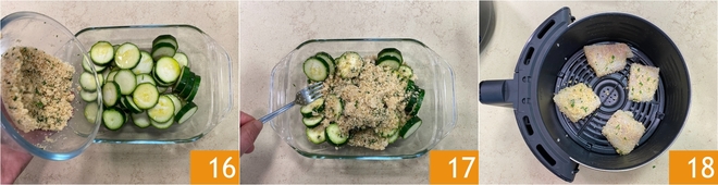 Despeje a farinha de rosca aromatizada restante sobre as abobrinhas 16 e misture para aderir bem às abobrinhas 17. Agora coloque os pedaços de peixe na cesta da fritadeira elétrica 18 (usamos uma fritadeira com capacidade de 6 litros). Ajuste conforme o tamanho da sua fritadeira, o peixe não deve se sobrepor; se a fritadeira não for grande o suficiente, pode ser necessário cozinhar em várias etapas.