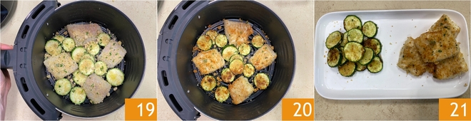 Coloque as rodelas de abobrinha empanadas nos espaços vazios 19, tentando não sobrepor muito. Cozinhe por 15 minutos a 180°, até dourar 20. O bacalhau na fritadeira elétrica está pronto para ser saboreado com as abobrinhas crocantes 21