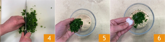 Pique a salsa 4 e adicione ao pão ralado 5, salgue a farinha de rosca 6.