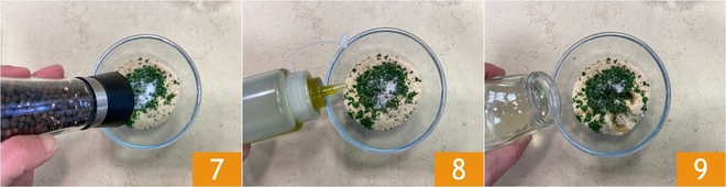 Adicione pimenta 7, depois tempere com um fio de azeite 8 e o vinho branco 9.