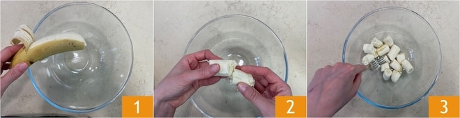 Para preparar o banana bread de chocolate, descasque as bananas 1 e quebre-as em uma tigela grande 2, depois amasse-as com um garfo 3.