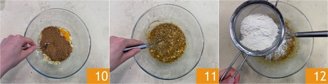 Misture com um batedor 10 até obter uma mistura homogênea 11. Neste ponto, peneire a farinha na tigela 12.