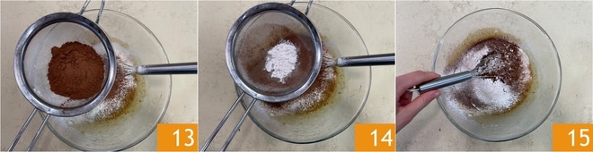 Peneire também o cacau em pó 13 e o fermento 14, depois misture bem tudo 15.