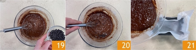Finalmente, adicione as gotas de chocolate 19 e incorpore-as uniformemente na mistura 20. Despeje a massa obtida em uma forma de bolo inglês forrada com papel manteiga de 20x7 cm 21.