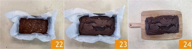 Asse em forno estático pré-aquecido a 180° por cerca de 30 minutos 22, verificando sempre o cozimento com um palito antes de retirar do forno. Uma vez assado, deixe o banana bread esfriar na forma 23, depois desenforme-o 24.