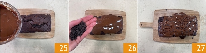 Derreta o chocolate ao leite no micro-ondas ou em banho-maria e deixe escorrer sobre a superfície do banana bread 25, depois decore com mais gotas de chocolate. Seu banana bread de chocolate está pronto para ser saboreado 27!