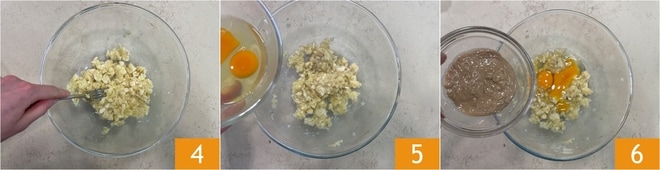 Quando você obtiver um purê cremoso 4, adicione os ovos 5 e a manteiga de amendoim 6.