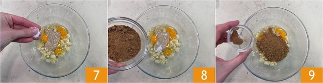Adicione também o sal 7, o açúcar mascavo 8 e a canela 9.