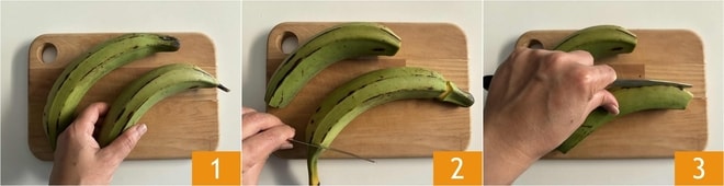 Para preparar a banana-da-terra frita, coloque a banana-da-terra sobre uma tábua de corte 1 e comece a limpá-la. Este ingrediente é muito similar às bananas, mas não é descascado da mesma maneira, portanto, você precisará de uma faca. Pegue a faca e corte e remova as extremidades 2, depois faça incisões ao longo de toda a banana-da-terra em vários pontos 3, para conseguir remover a casca de modo mais fácil.