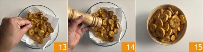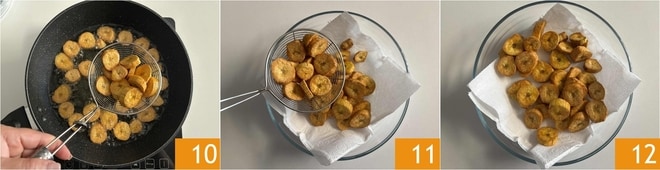 Cozinhe a banana-da-terra por cerca de 4-5 minutos, virando de vez em quando, para obter uma douração uniforme. Uma vez que a banana-da-terra esteja perfeitamente dourada, escorra do óleo 10 e coloque sobre papel toalha 11, para remover qualquer excesso de óleo 12.