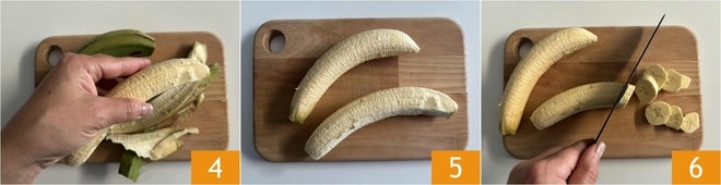 Depois de ter removido completamente a casca 4 5, corte a banana-da-terra em fatias de cerca de meio cm 6.