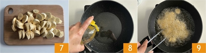 Uma vez obtidas todas as fatias de banana-da-terra 7, coloque óleo de amendoim abundante em uma frigideira grande, aqueça até atingir a temperatura de 170° 8. Quando estiver bem quente, mergulhe as fatias de banana-da-terra 9, certificando-se de adicionar poucas de cada vez. Você pode verificar a temperatura com um termômetro de cozinha; se não tiver um, coloque uma única fatia de banana-da-terra no óleo para verificar se está suficientemente quente para iniciar o cozimento.