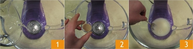 Para realizar os baozi, primeiro prepare a massa: despeje a água na tigela de uma batedeira equipada com gancho 1, adicione o fermento seco 2 e mexa brevemente com uma colher para dissolvê-lo 3.