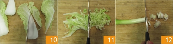 Enquanto isso, prepare o recheio: elimine a parte central do repolho chinês 10 e pique a folha 11, depois pique finamente também a cebolinha 12.