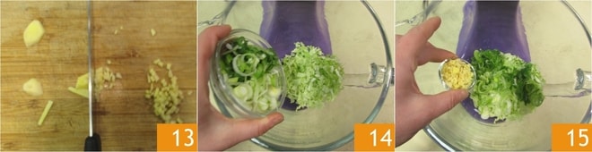 Descasque e pique o gengibre, ou alternativamente, você pode ralá-lo 13. Na tigela da batedeira equipada com a pá, coloque o repolho chinês, a cebolinha 14 e o gengibre 15.