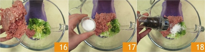 Adicione a carne de porco moída 16, o açúcar 17, o sal e a pimenta 18.