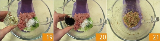Finalmente, tempere com o óleo de gergelim 19 e o molho de soja 20 e ligue a batedeira na velocidade mínima por 5 minutos, até que os ingredientes estejam bem misturados 21.