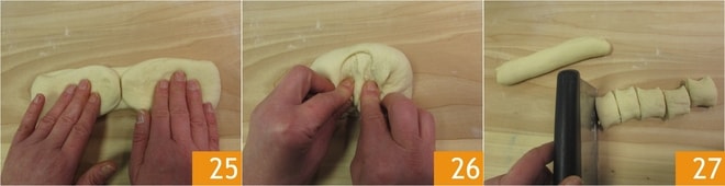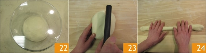 Decorrido o tempo de fermentação 22, transfira a massa para a superfície de trabalho levemente enfarinhada e, depois de trabalhá-la brevemente, divida-a em 3 porções com a ajuda de um raspador 23. Estenda cada porção com a ponta dos dedos para formar rolinhos 24.