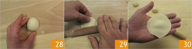 Arredonde cada pedaço de massa na superfície de trabalho para formar uma bolinha 28, depois achate-a com a palma da mão. Nesse ponto, pegue um pequeno rolo e pressione-o nas bordas do disco com a mão direita, enquanto com a mão esquerda gire a massa no sentido anti-horário 29; dessa forma, as bordas ficarão mais finas enquanto o centro permanecerá mais espesso para reter melhor os sucos do recheio 30.