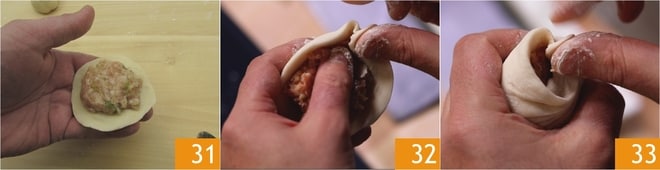 Proceda desta forma com todos os discos de massa, depois divida o recheio em porções de 25 g cada. Adicione uma porção de recheio no centro de cada disco 31 e espalhe-a levemente com uma colher de chá. Para fechar os baozi enfarinhe bem os dedos para evitar que as bordas se umedeçam: mantenha o polegar fixo na borda da massa 32 enquanto com o indicador puxe e belisque o resto da massa 33.