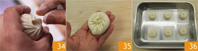 Ao chegar ao final, belisque o topo e gire o baozi com a mão para selá-lo 34, depois gire-o na superfície de trabalho para arredondá-lo 35. À medida que forma os baozi, coloque-os em quadrados de papel manteiga que você terá previamente disposto em uma assadeira. Quando todos estiverem formados 36, cubra a assadeira com filme plástico e deixe crescer em temperatura ambiente por 40 minutos.