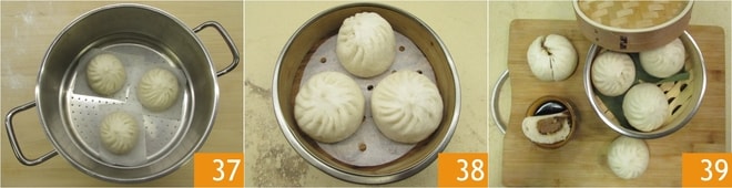 Decorrido esse tempo, você está pronto para o cozimento: leve a água em uma vaporizadora para ferver e coloque os baozi junto com o seu quadrado de papel manteiga 37. Cubra com a tampa e cozinhe por cerca de 12-13 minutos. Uma vez cozidos, apague o fogo e deixe-os descansar na panela por mais 2 minutos, depois transfira-os para a tradicional cesta de bambu 38. Seus baozi estão prontos para serem servidos 39!
