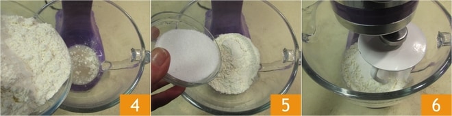 Adicione a farinha de trigo 4 e o açúcar 5 e ligue a batedeira na velocidade mínima por 5-6 minutos 6.