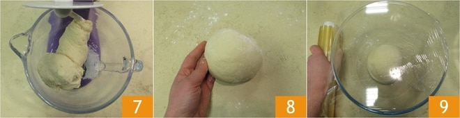 Quando a mistura estiver compacta 7, transfira para a superfície de trabalho levemente enfarinhada e trabalhe-a brevemente para dar uma forma redonda e lisa 8. Coloque a massa em uma tigela, cubra com filme plástico 9 e deixe descansar em temperatura ambiente por cerca de 40 minutos.