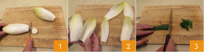 Para preparar as barquinhas de endívia com queijos, comece pela limpeza das verduras. Enxágue as verduras e seque-as bem com um pano limpo. Depois, elimine a parte do talo da endívia 1. Desfolhe-a delicadamente para obter 12 folhas 2, tomando cuidado para não quebrá-las. Reserve-as. Prossegue picando finamente a cebolinha 3.