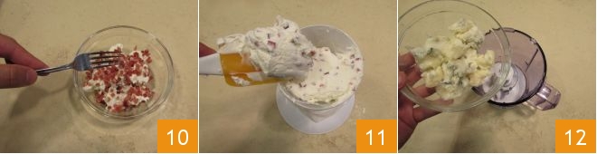Na outra tigelinha com robiola, adicione o speck 10, tomando cuidado para reservar alguns cubinhos de speck para decorar ao final. Misture com a robiola e transfira para um segundo saco de confeitar com bico de estrela 11 que você reservará. Proceda com a preparação do terceiro creme: no liquidificador, bata o gorgonzola 12.
