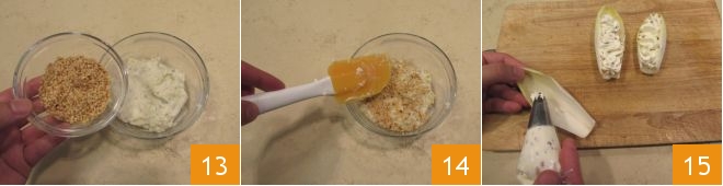 Quando tiver obtido um creme homogêneo, transfira para uma tigelinha e adicione as nozes picadas 13. Reserve algumas nozes para a decoração final. Misture os ingredientes com uma espátula 14 e também transfira este creme para um saco de confeitar com bico de estrela. A esta altura, os cremes estão prontos e você pode prosseguir com o recheio das folhas de endívia. Pegue uma folha de endívia e o primeiro saco de confeitar com o creme de queijo de cabra e cebolinha. Preencha a cavidade da folha 15.