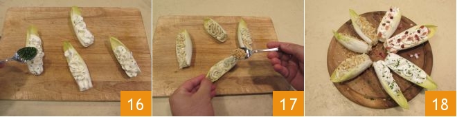 Decore com uma colherinha de cebolinha cada folha 15. Prossiga preenchendo outras 3 folhas com o creme de queijo de cabra e cebolinha, decorando com a cebolinha picada, depois outras 4 com robiola e speck, colocando alguns cubinhos de speck, e depois outras 4 com o creme de gorgonzola e nozes, decorando com as nozes picadas 17. Suas barquinhas de endívia e queijos estão agora prontas para um aperitivo delicioso 18!