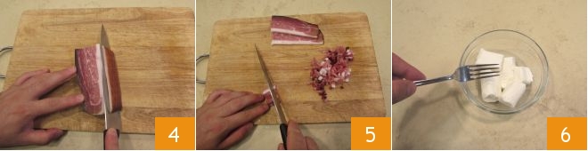 Depois corte a pele do speck 4, depois em tiras bem finas e corte-as em cubinhos 5. Então, prepare os diversos recheios com os queijos: coloque a robiola e o queijo de cabra e desfaça os queijos com um garfo 6.
