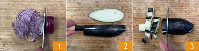 Para preparar o basmati com caponata de legumes, primeiro prepare os legumes: limpe as cebolas roxas e corte-as em julienne 1, depois corte as berinjelas em fatias de 2 cm de espessura 2 e reduza-as a cubos 3.