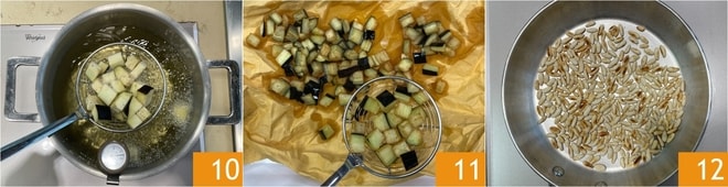 Aqueça o óleo de sementes a uma temperatura de 180° e frite algumas berinjelas de cada vez por cerca de 3-4 minutos 10. Escorra as berinjelas em papel toalha 11 e reserve. Coloque os pinholes em uma panela já quente e toste-os em fogo médio por cerca de 5 minutos, mexendo frequentemente. Quando estiverem dourados, desligue o fogo e reserve 12.