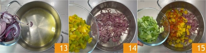 Passe para a preparação da caponata: aqueça uma boa quantidade de óleo em uma panela grande, depois adicione as cebolas 13 e cozinhe em fogo médio por 3 minutos. Adicione os pimentões 14 e o aipo 15 e refogue por 5 minutos.