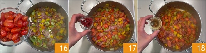Nesse ponto, adicione os tomatinhos 16 e o extrato de tomate 17 e continue cozinhando por mais 5 minutos, depois adicione o vinagre 18.